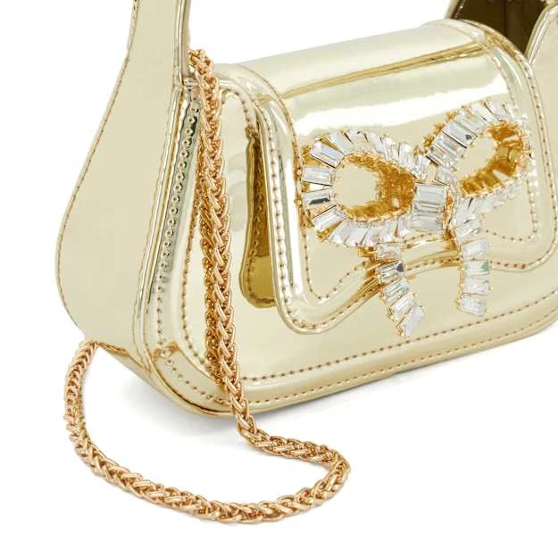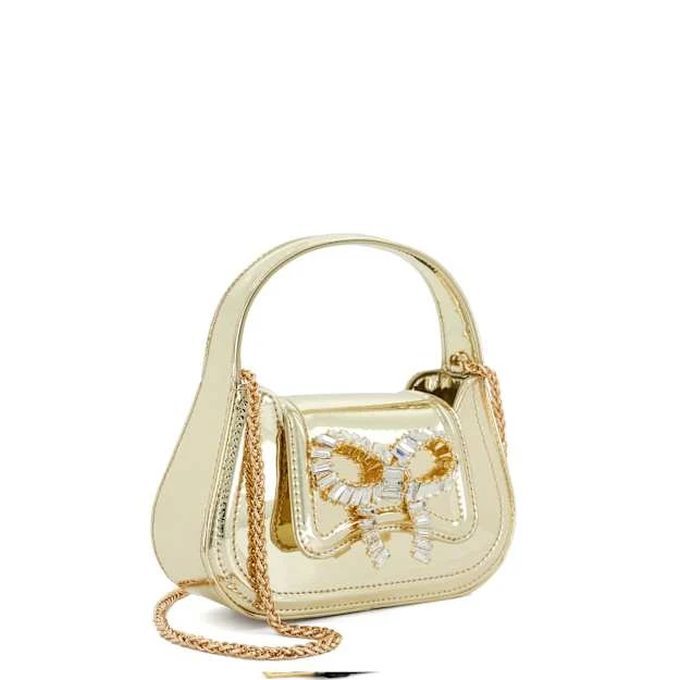 Tap into the mirror-metallic trend with our Bowley grab bag. Boasting a diamante bow detail, this scene-stealing style is detailed with a magnetic-flap closure and optional chain strap for versatile styling and ease of wear. Certain to take your occasion ensembles to the next level, the interior houses our bespoke ‘DD-interlock-branded jacquard lining and a side pocket for organised storage. Pair yours with our matching Happiest slingback pumps.