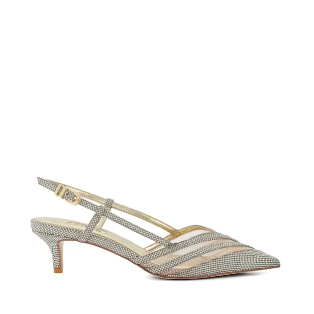 Taking style cues from the runaways, our kitten-heeled profile takes the classic slingback court and updates the look for the season with a scene-stealing combination of see-through mesh and diamante embellishments for a look that truly sparkles. Finished with a side buckle for the ideal fit and our signature branding.
