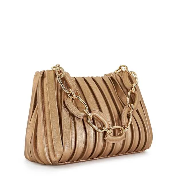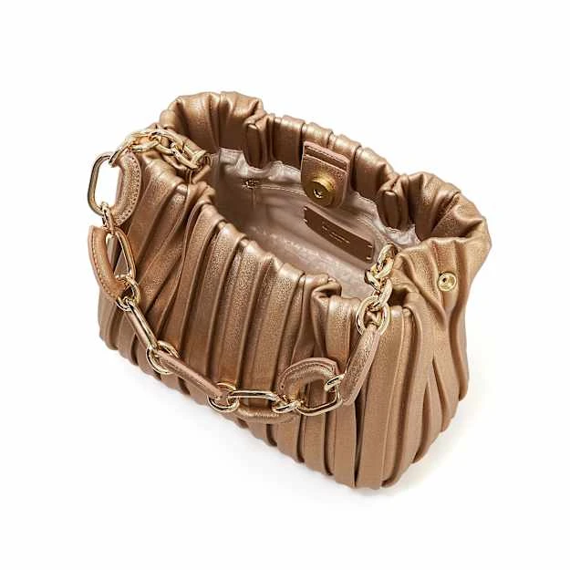 Relaxed formal’ springs to mind when we think of Dominie. Boasting a metallic rose-gold finish, this standout bag is soft and slouchy with a pleated exterior. Finished with a magnetic closure, an optional crossbody strap for ease of wear and complemented with a chain top handle to hold or tuck away out of sight, the spacious interior is enhanced with a zipped side pocket and our bespoke ‘DD’-interlock-branded jacquard lining.