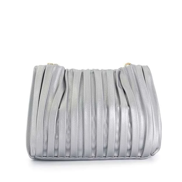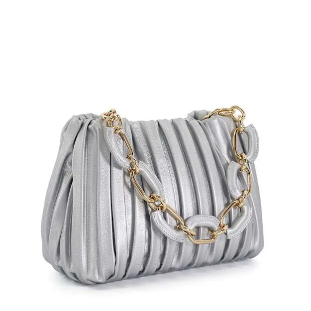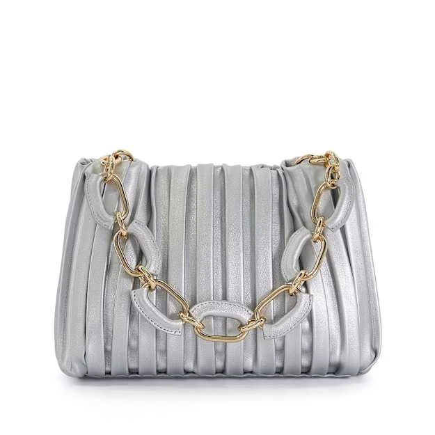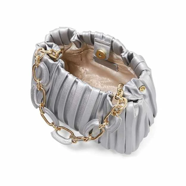 Relaxed formal’ springs to mind when we think of Diniominie. Boasting a metallic-silver finish, this small standout bag is soft and slouchy with a pleated exterior. Finished with a magnetic closure, an optional crossbody strap for ease of wear and complemented with a chain top handle to hold or tuck away out of sight, the spacious interior is enhanced with a zipped side pocket and our bespoke ‘DD’-interlock-branded jacquard lining.