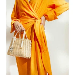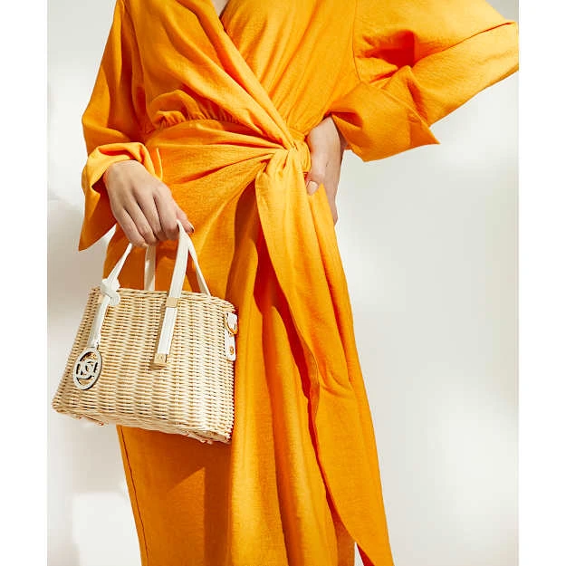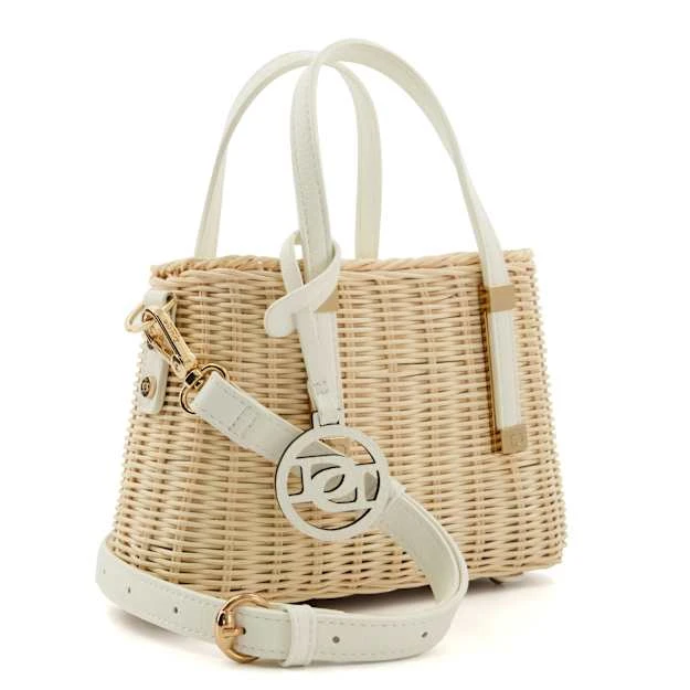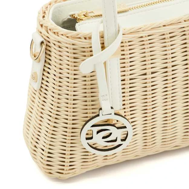 Get ready for warm-weather adventures with Dinkydorries. This stylish rattan-woven tote bag features a central top-zip compartment, polished hardware trims, and an optional cross-body strap for ease of wear. The fully lined interior hosts a branded side pocket, finished with two top handles, one of which is enhanced with our bespoke ‘DD’-interlock branding.