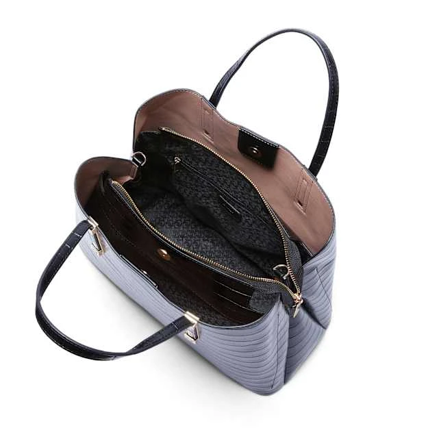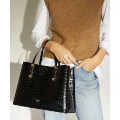 A classic tote is a wardrobe staple, and our elegant Dinkydorrie profile is the ideal timeless rendition. Crafted from recycled materials, this croc-effect style has been complemented by our bespoke brand-engraved metal hardware trims and is detailed with a top magnetic closure and central zip for double the security. Culminating with an optional strap for versatile styling and ease of wear, the interior is split into three separate compartments for organised storage.