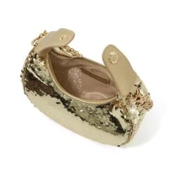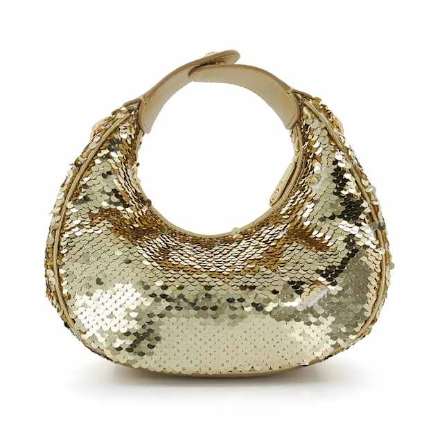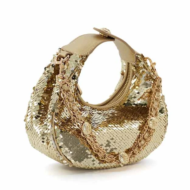 Elevate your edit with our crescent-shaped Dressings grab. Featuring our signature logo and detailed with a fastened top handle, this small sequined design boasts a scene-stealing combination of detachable small, thread-through and branded-coin chains that’s certain to take your everyday styling to the next level. Culminating with a top zip closure, the interior of this gold silhouette houses a side pocket for organised storage and our ‘DD’-interlock jacquard lining.