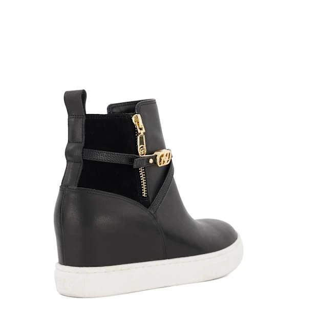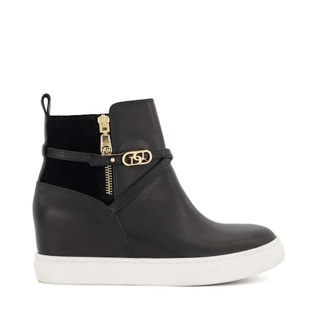 Take your leisurewear edit to the next level with our sneaker, Emerson. Crafted from the finest leather, this round-toed silhouette is detailed with a back pull-on tab, as well as a metal side zip and buckled strap, enhanced with our bespoke ‘DD-interlock branding. Set on a contrasting wedge heel, our standout trainer will partner perfectly with everyday ensembles.