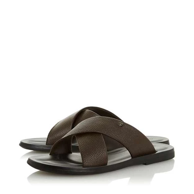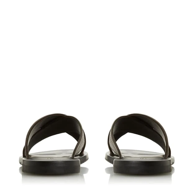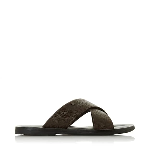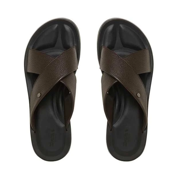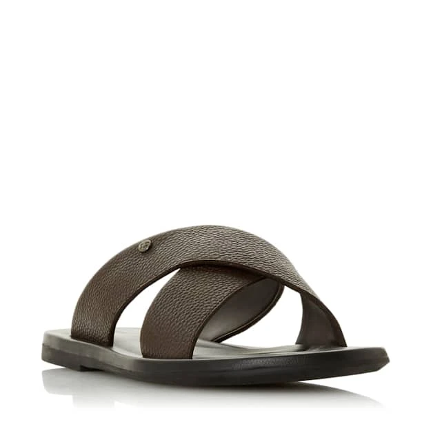 For charming summer footwear, look no further than this sandal. Fitted with a soft, flat sole for all day comfort and support. It features two crossed straps with a brand-embossed metal charm.