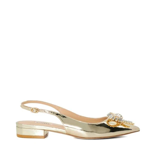 The season’s key silhouette, elevate your ensembles for our standout Happiest ballet pumps. In trend-led metallic gold, this point-toed silhouette features a large diamante-embellished bow that’s certain to take your lineup to new heights. Set on a low block heel for added height with ease of wear and culminating with a buckled slingback for a comfortable fit, this scene-stealing style is certain to sparkle with every step.