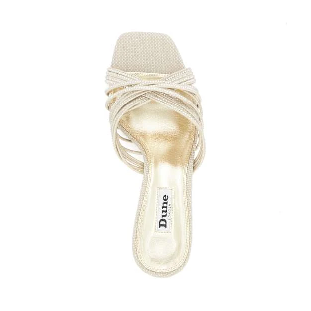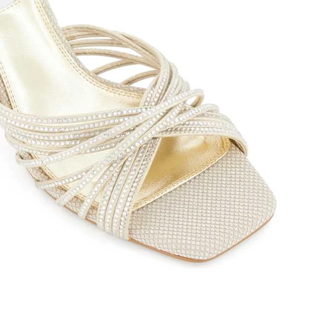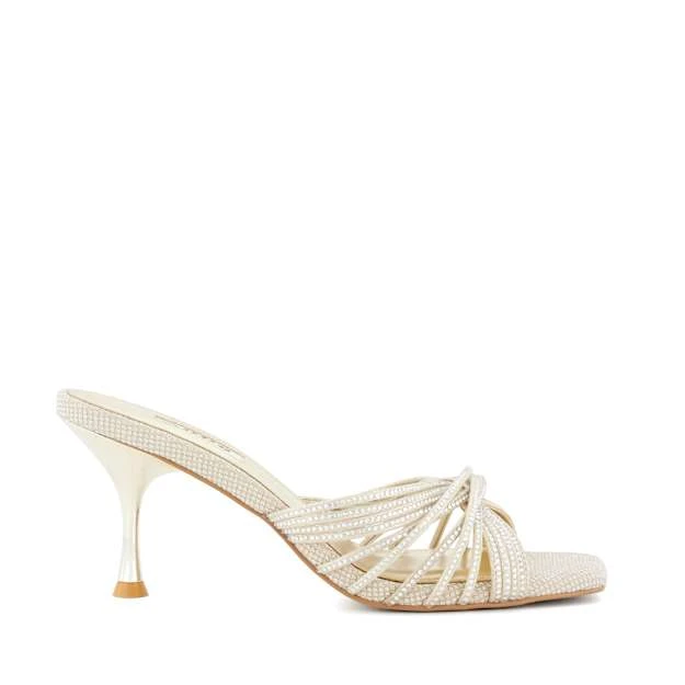 Take your mule edit to the next level with stand-out style, Marquee. Set on a flared stiletto heel that rises to a flattering 10.5cm, the upper culminates in a multitude of skinny cross straps, all of which are enhanced with small diamante embellishments that sparkles with every step. Finished with an open toe and lined footbed, fashion-forward Marquee will become the focal point of any occasion ensemble.
