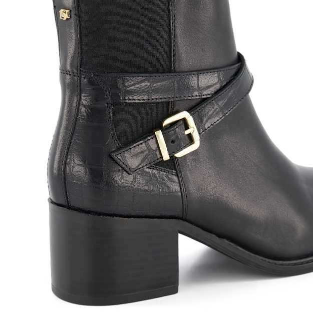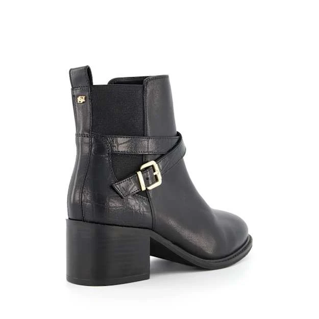 A classic pair of ankle boots with subtle detailing. Featuring a rear pull tab with our initial logo and croc effect on the ankle strap and back of the heel. Resting on a comfortable low block heel the elasticated panel ensures a comfortable fit and the inside zip fastening making them easy to pull on and off.