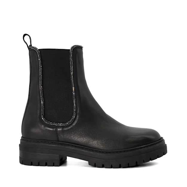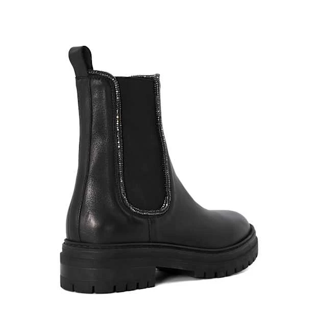 Synonymous with Dune London, the Chelsea boot is a long-standing classic favoured for its transitional appeal. Pursuit perfectly blends a contemporary aesthetic with our iconic heritage. Crafted from leather and boasting a diamante trim for a fashion-forward finish, the round-toe style has been set on a contemporary cleated outsole and has been detailed with elastic inserts and a pull-on tab for added convenience. Finished with a rubber sole, this perennial style will become a go-to styling solution all season long.