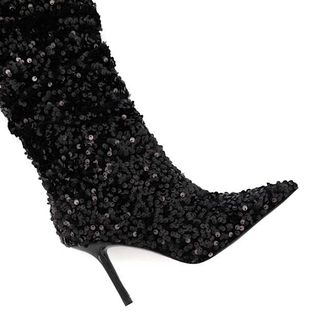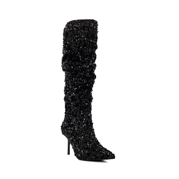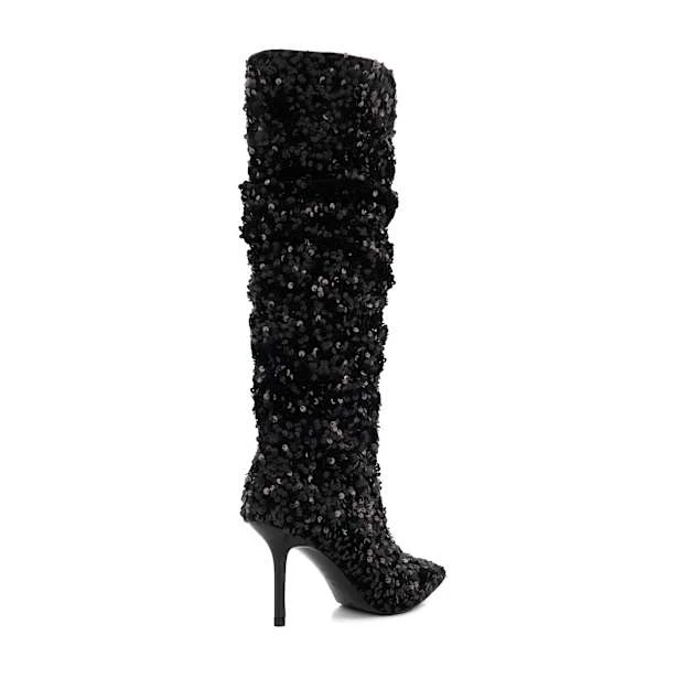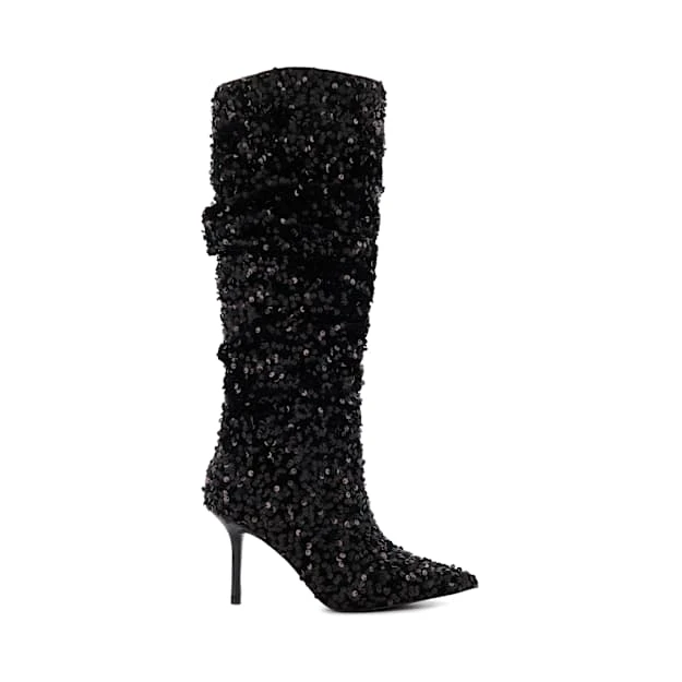 Take your edit to new style heights with our knee-high boot, Sensational. Set on a flattering stiletto heel, the upper of this point-toed silhouette is beaded with sequin embellishments throughout. Finished with a side zip, this standout style will take your occasion looks to the next level.