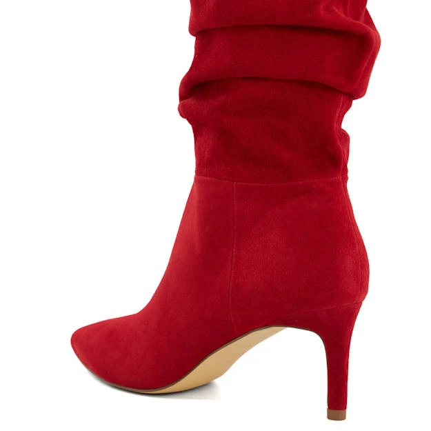 In trend-led red, refresh your edit with our Slouch pull-on boots. Stopping at the calf and crafted from the finest suede, this statement-making style is enhanced with a slouchy ruched finish. Set on a flattering stiletto heel, this point-toed silhouette will take your styling to the next level during the colder months.